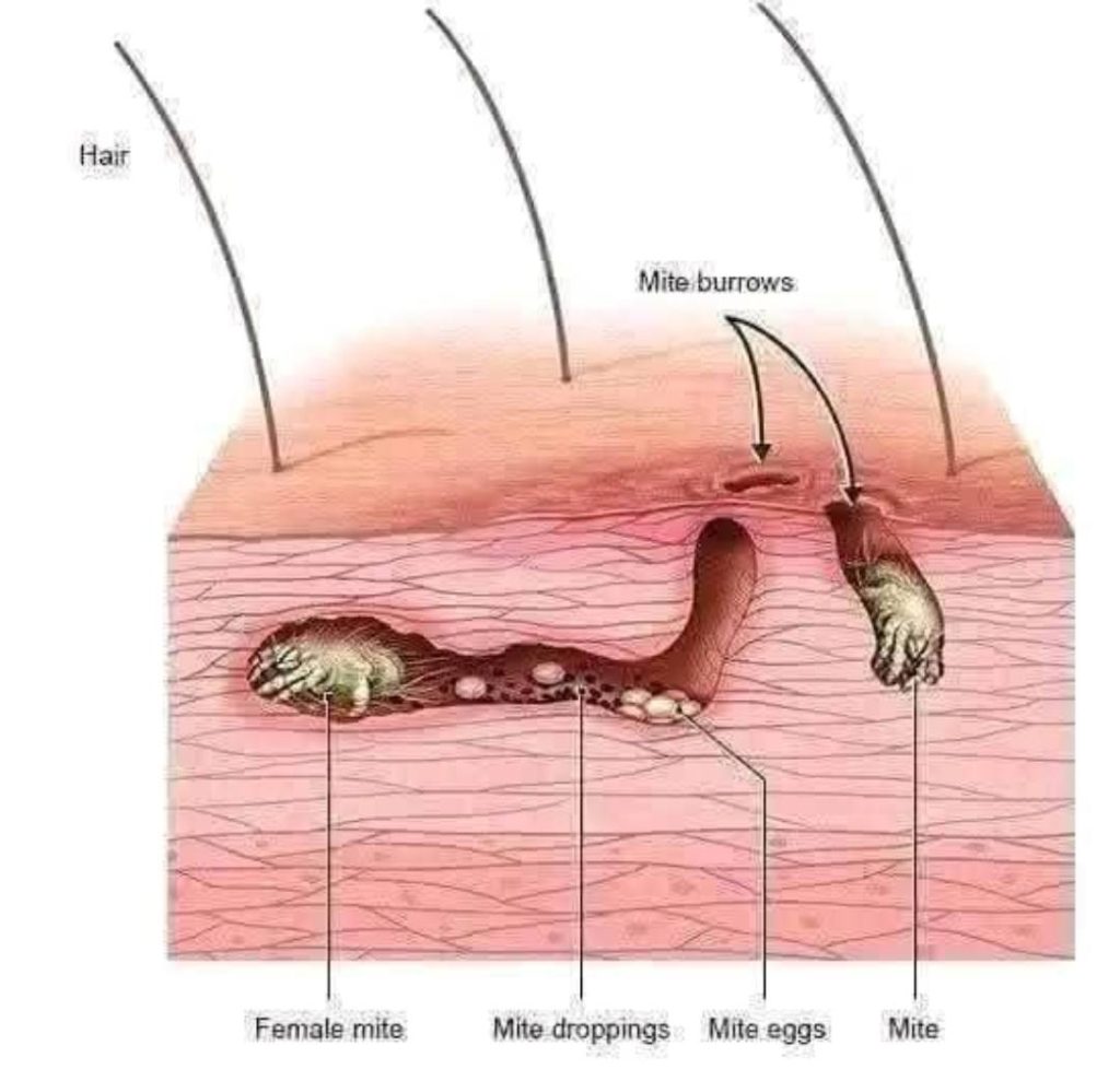 • গর্তের চিহ্ন – ত্বকে সরু, আঁকাবাঁকা, সাদা বা ধূসর রেখার মতো চিহ্ন যা মাকড়সার গর্ত নির্দেশ করে